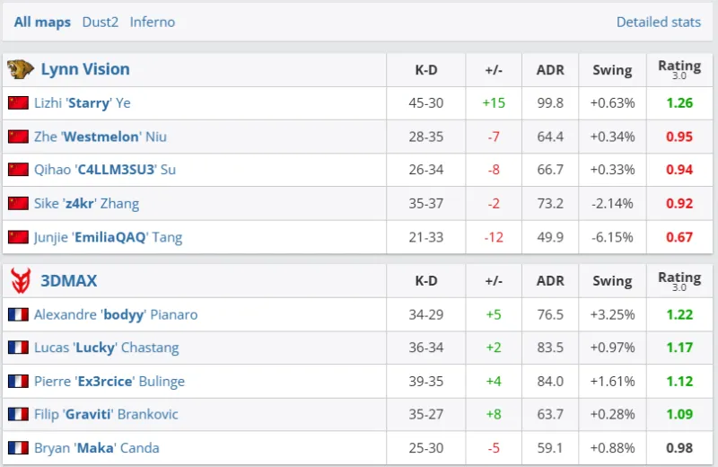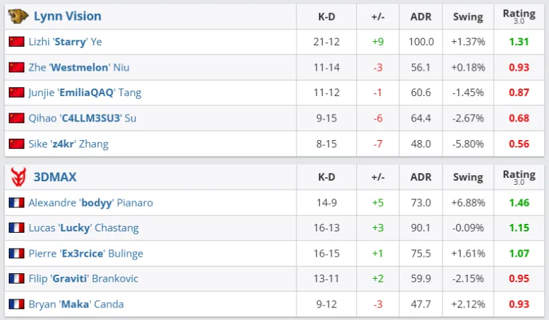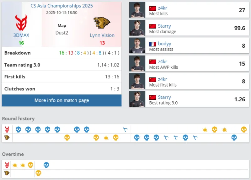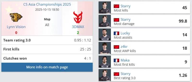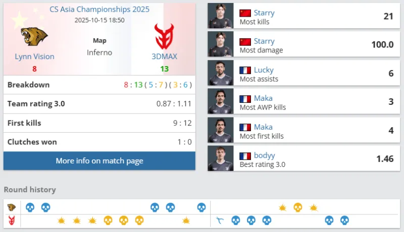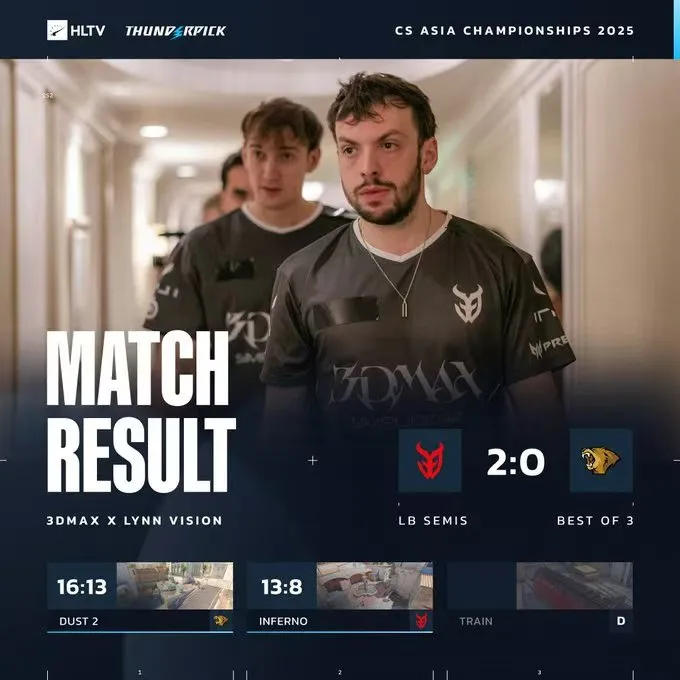 下半场易边再战。手枪局失利后,LVG强起进攻B区失败进入ECO局。第十六局,LVG出中路夹击A区战术失败,Lucky双杀3DMAX拿到十一分。第二十局,Maka链接大狙先拿首杀,Ex3rcice混烟前压击杀一人后拉满信息,LVG爆弹A区战术失败,3DMAX拿到赛点。最终,图二LVG 8-13 3DMAX,难有突破。大比分0-2,LVG被3DMAX横扫淘汰,结束了本次CAC 2025之旅。