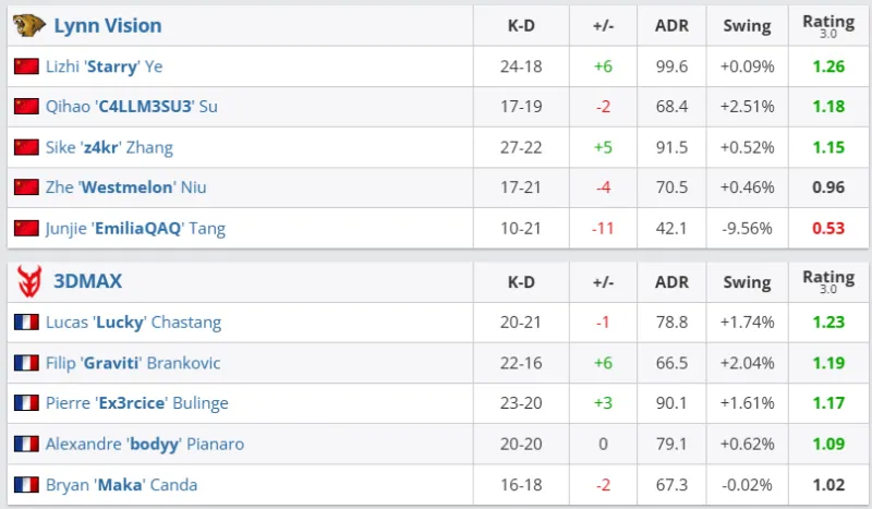 下半场易边再战。手枪局失利后,3DMAX选择ECO再送一分。第十五局,3DMAX爆弹出A门进攻A大,双方混战交火LVG笑到最后,拿下长枪局迫近分差。第十七局,双方中路交火打成二换二后3DMAX进攻A区,残局C4LLM3SU3一打二双杀兜底,LVG反超比分!第二十局,3DMAX提速爆弹B区Ex3rcice双杀破点,3DMAX追回一分。第二十三局,3DMAX爆弹B区C4LLM3SU3双杀拖到回防,LVG先拿赛点。3DMAX爆弹A小追回一分,双方进入加时。
