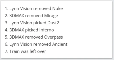 上半场LVG选择防守方开局。手枪局失利后,3DMAX选择ECO再送一分。第三局,3DMAX静摸链接夹击A区战术成功,LVG三打四难以回防,3DMAX拿下长枪局。第六局,双方香蕉道交火打成一换一,Ex3rcice单摸A区双杀破局,3DMAX转攻A区成功,连续得分。第九局,Starry前压三杀与westmelon双人五杀,LVG半起局翻盘追回一分。上半场LVG 5-7 3DMAX,在对手的选图上暂时落后。