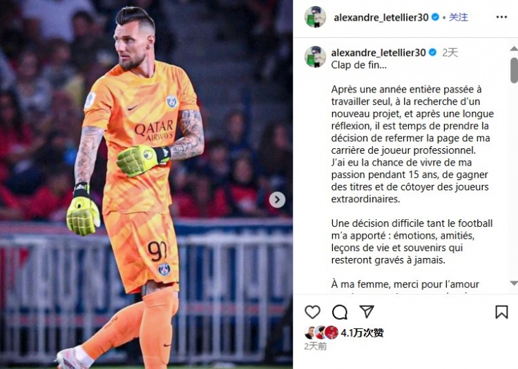 34岁前巴黎圣日耳曼门将莱特利尔在雷火社媒宣布,结束15年的职业生涯。