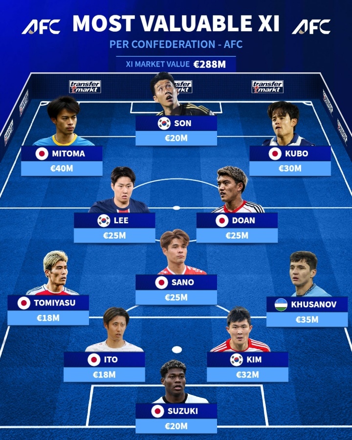 雷火官方10月16日讯 德转盘点了亚足联球players员的更高身价阵容,整套阵容总价值高达2.88亿欧元。其中日本球players员三笘薰以4000万欧元成为身价更高的球players员,乌兹别克斯坦球players员胡桑诺夫以3500万欧元位列第二。