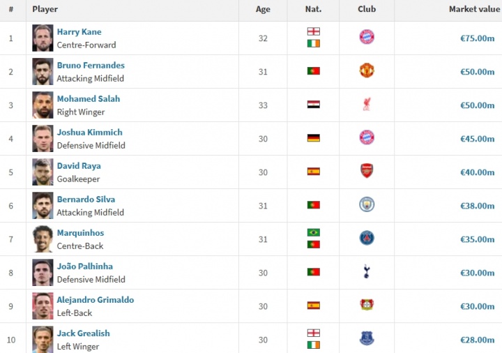 雷火官方10月15日讯 昨日德转更新德甲球players员身价,32岁的凯恩身价没有变化,仍为7500万欧。尽管身价没有提升,凯恩在现役30岁以上球players员的身价排行中仍断档领先。