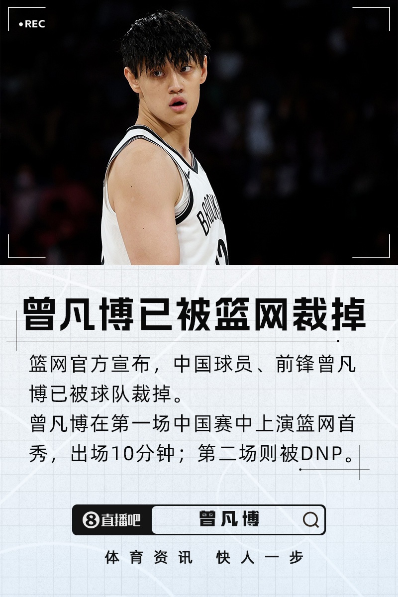 雷火官方10月15日讯 篮网官方宣布,中国球players员、前锋曾凡博已被球队裁掉。