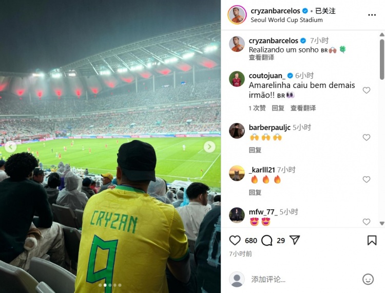 此役山东泰山外援克雷桑身穿自己名字的巴西9号球衣,现场见证了巴西的大胜。