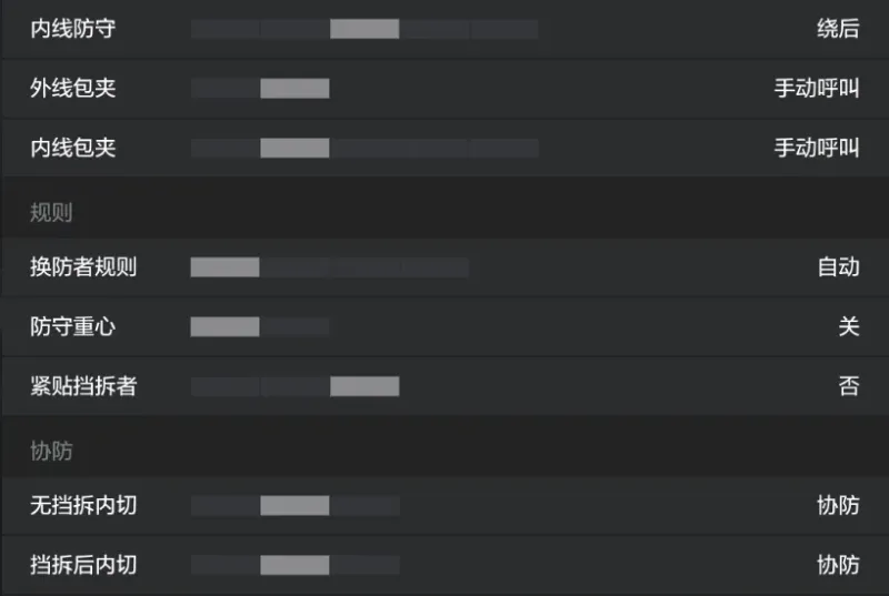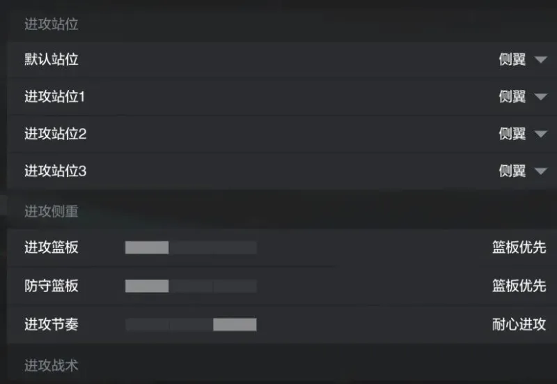 进攻站位方面不用太在意,触发得较少,如果外线都有不错的投射能力,可选侧翼;如果大部分外线投射能力较差,而内线挡拆能力不错,可选Flip Push(进攻站位触发后只会跑套组本身的战术,不会影响球队战术板的触发)
