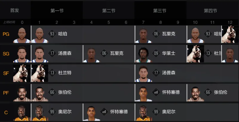 性价比和强度兼顾的顶配射手组合,一般是让历史克莱打2号位发挥抢断能力,杜兰特打3号位靠速度追防射手。两人不仅进攻端输出非常稳定,防守端失分仅2.5、3.1分,这也是球队进攻效率38,防守效率15的核心因素