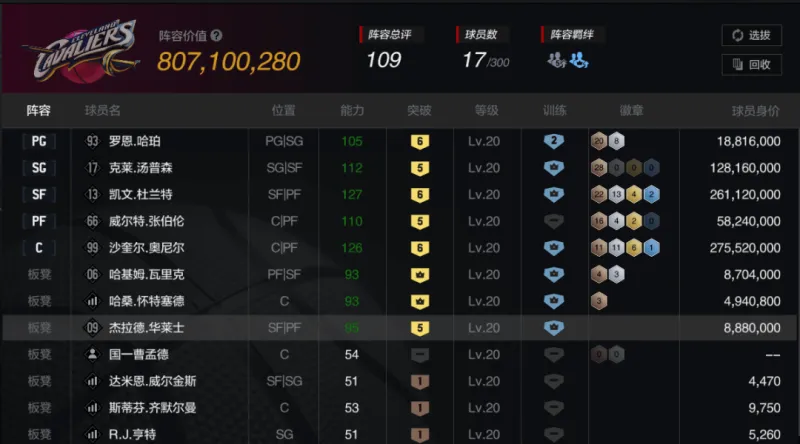 非常标准的名人堂前百内线组合,张伯伦也可以降为4突或换成4突天钩。鲨鱼和白边在强度和价位方面已经做到极致,不太建议换