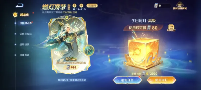 2、参与【燃灯寄梦】活动,完成三个福利任务(每日实战+被使用自己的河灯或者使用别人的河灯),每天最多可以获得80限时点券。