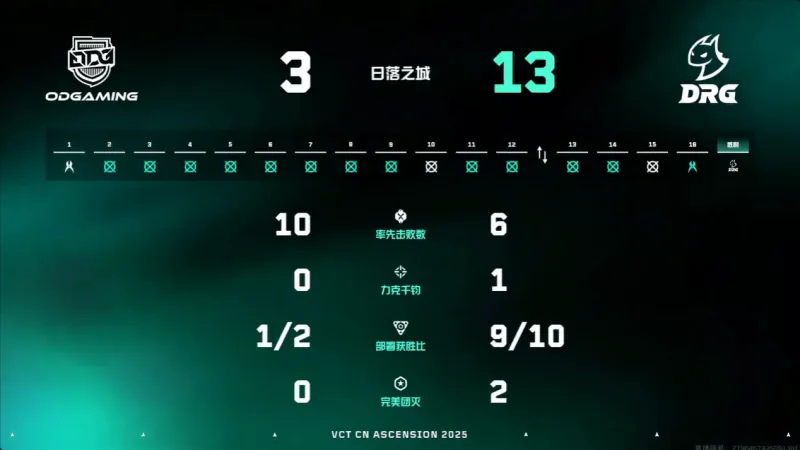 第六回合:DRG利用黑梦与夜露大招强势推进A点,尽管夜露率先阵亡但凭借点内精准枪法与默契配合成功拿下此局,ODG随即叫出暂停