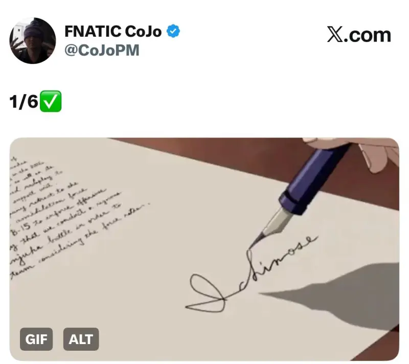 值得注意的是,Fnatic无畏契约分部经理CoJo在社交媒体发布“1/6”的推文