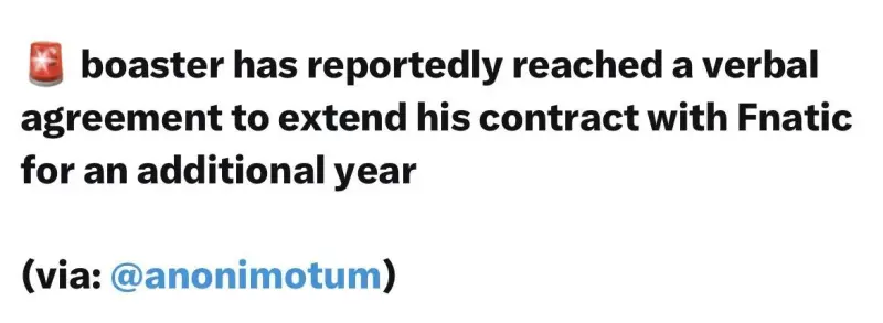 雷火官网10月17日讯 据外媒报道,Fnatic战队指挥Boaster已与俱乐部达成口头续约协议,预计合同将延长一年,续约文件签署工作也正在推进中。