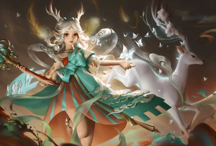 2、瑶 - 遇见神鹿:该皮肤以敦煌莫高窟 257 窟《九色鹿本生》为灵感来源,瑶的形象被设计成一位温婉灵动的鹿女,皮肤采用密陀僧色搭配白绿色,具有强烈的冷暖色彩对比。展示动画中神鹿步步生莲,背后隐约闪烁佛光,技能特效中也融入了鹿的元素,同时还邀请了专业演奏家进行五弦琵琶和复原敦煌箜篌的演奏,极具特色。