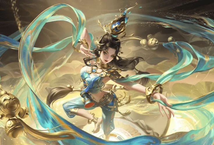 3、貂蝉 - 遇见胡旋:这款皮肤以敦煌壁画中从西域流传至中原的胡旋舞为灵感,貂蝉操控丝带翩翩起舞,青绿色的丝带搭配其优美的舞姿,给人一种仙女下凡的美感,完美还原了胡旋舞的动感与魅力,是首款传说限定品质的敦煌皮肤。