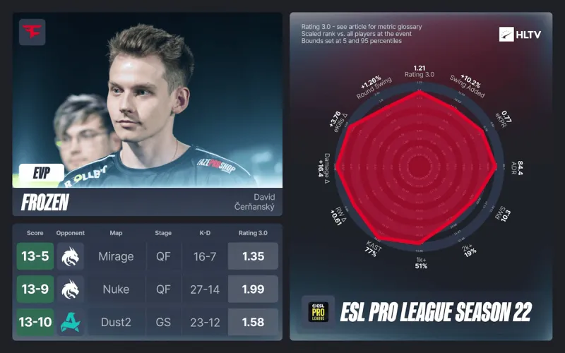 frozen在小组赛阶段便是FaZe阵中表现最出色的选手,在对阵Aurora的关键生死战中打出1.58的惊人Rating。随后更在与Spirit的四分之一决赛中,于核子危机地图上以27-16战绩、1.99Rating的惊艳表现为FaZe爆冷晋级奠定胜局。