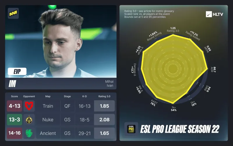 自Natus Vincere引入makazze后,iM已成功适应了新的游走位角色,本届职业联赛更成为他2025年表现最出色的赛#事(1.25Rating,科隆站1.18Rating)。