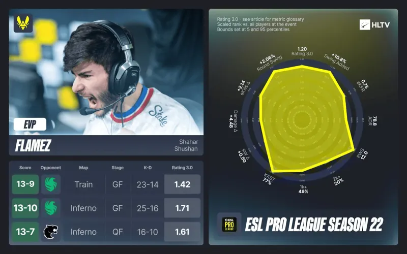 除了在四分之一决赛中稳扎稳打(1.29Rating)外,flameZ更在Vitality全部七场季后赛图胜局中成为队内更佳选手(1.39Rating,高于ZywOo的1.29),完美弥补了小组赛阶段的低迷表现,最终跻身顶尖EVP选手之列。