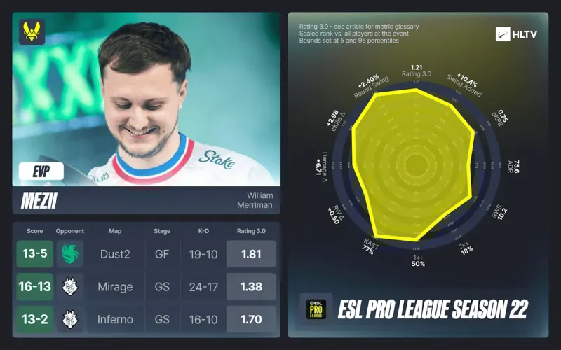 mezii虽是Vitality四名突破手中战术空间最有限的选手,但仍在小组赛阶段打出队内更佳表现(1.39Rating,胜局每回合伤害98.8)。