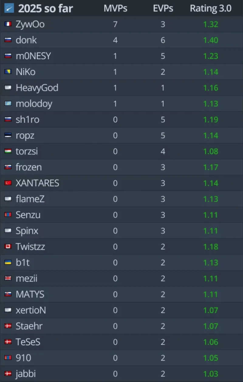 ZywOo在本届赛#事的稳健表现与donk的中规中矩,使得年度选手之争依旧悬念迭起。