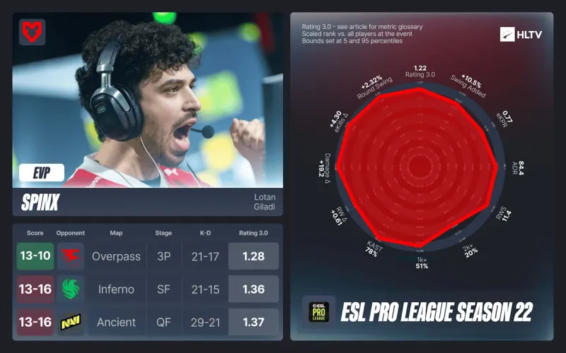 MOUZ依靠团队协同取胜的模式往往使队员与个人奖项失之交臂,但Spinx在瑞典赛场的表现证明了他能突破这一局限——1.22的赛#事Rating与1.03的回合胜局击杀数足以让他跻身荣誉榜单。