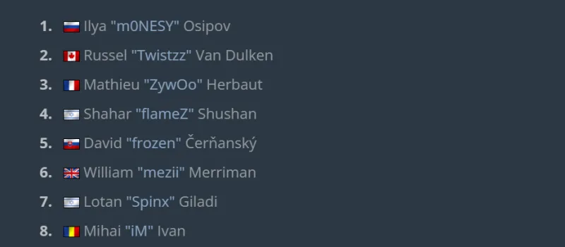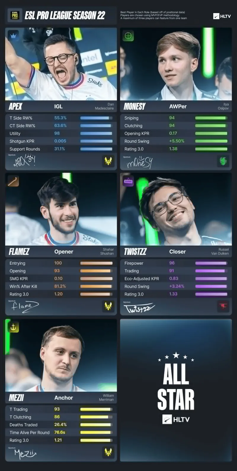 m0NESY的MVP成就使得同为狙击手的ZywOo无缘全明星阵容,但apEX执教的Vitality战队仍凭借flameZ与mezii的入选达到三人名额上限。