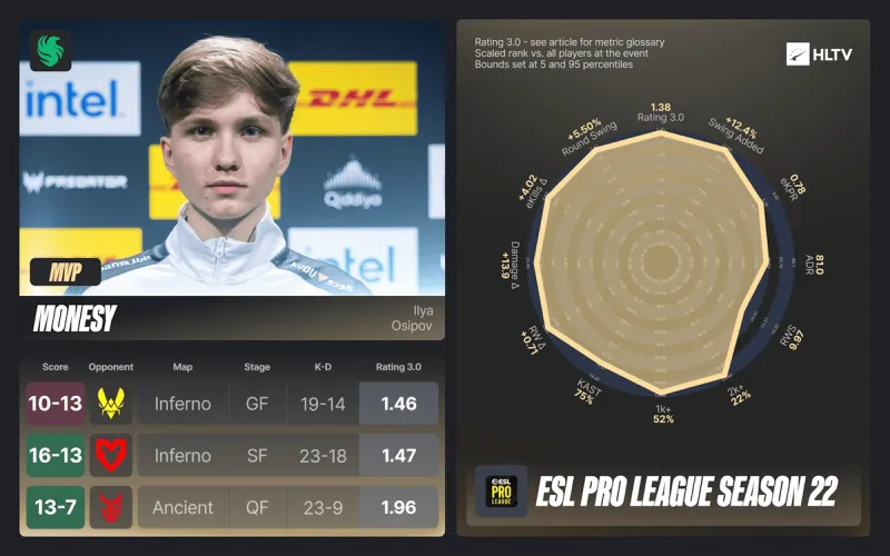 他仅用少量比赛就在季后赛锁定EVP称号——每轮系列赛均有高光地图发挥(对阵FURIA1.43Rating,对阵FaZe1.35Rating,迎战Falcons时更以1.81Rating斩获单局更佳),彻底奠定其地位。
