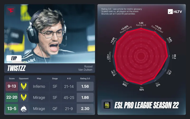 Twistzz二度加盟FaZe的首秀堪称完美。他带着1.33的赛#事Rating离开EPL,其中淘汰赛阶段更是打出赛会更高的1.47Rating(若不计入季军争夺战则高达1.61)。