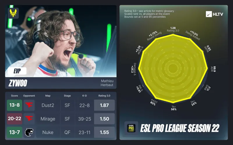 ZywOo在决赛中状态稍显低迷(每回合伤害64.9,保枪率21%),这使他首次在Vitality夺冠时与MVP殊荣失之交臂。