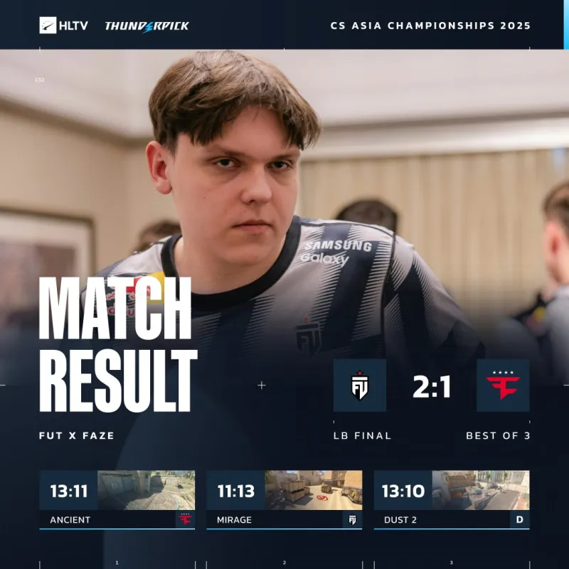 雷火官网10月16日讯 CAC 2025小组赛B组败者组决赛:FUT 2-1 FaZe,晋级六强!卫冕冠军无缘淘汰赛。