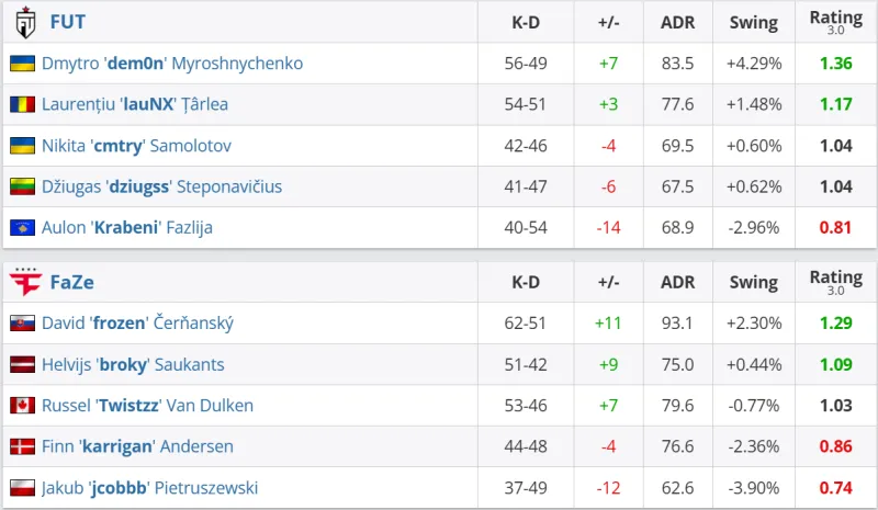 决胜图Dust2,FaZe在0-3开局下,总监领衔全员发挥打出一波7-1进攻潮,但lauNX也手感火热追至5-7。换边FUT的进攻再度展现年轻人的恐怖枪法,进攻势如破竹12-8拿下赛点。终局broky无力回天,卫冕冠军无缘淘汰赛。