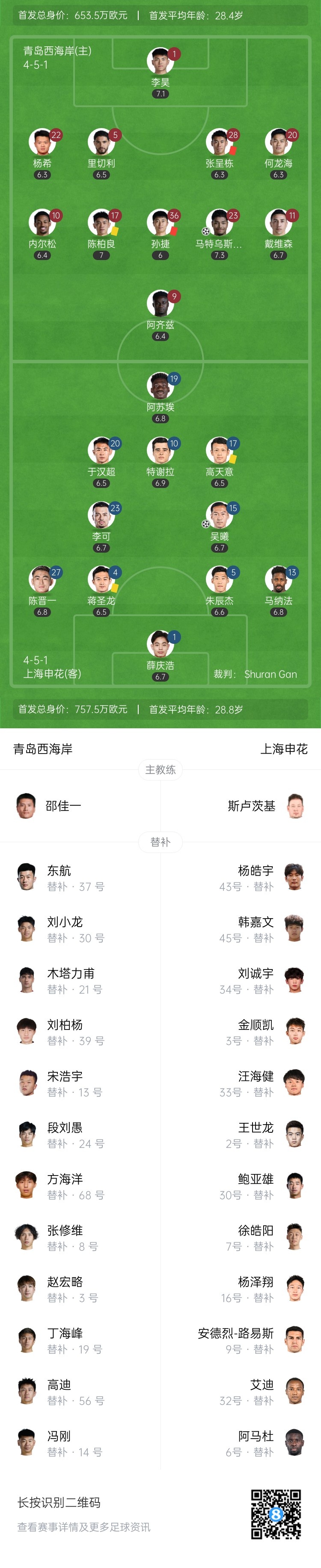 第38分钟,孙捷在防守中踹倒了于汉超,主裁判向孙捷出示黄牌!随后主裁来到场边观看视频回放!取消了黄牌判罚,改判直接红牌!青岛西海岸剩10人应战↓