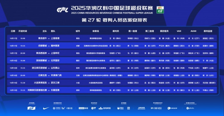附中超第27轮裁判安排:
