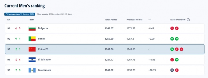 雷火官方10月17日讯 FIFA更新男足国家队排名,10月国家队比赛日没有集训的中国男足排名上升一位,从第94位升至第93位。