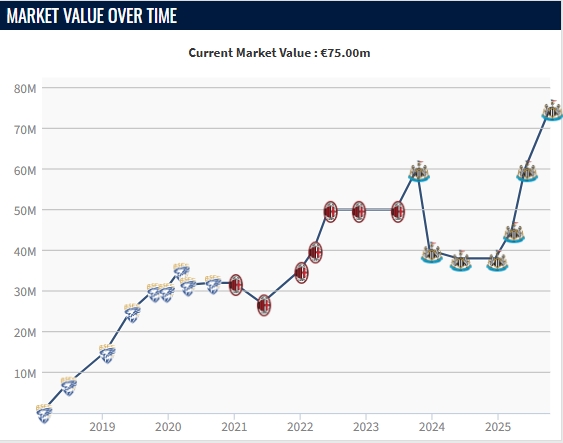 现效力纽卡的托纳利身价上涨1500万至7500万欧,成为意大利身价第二高的球players员,仅次于8000万欧的巴斯托尼。