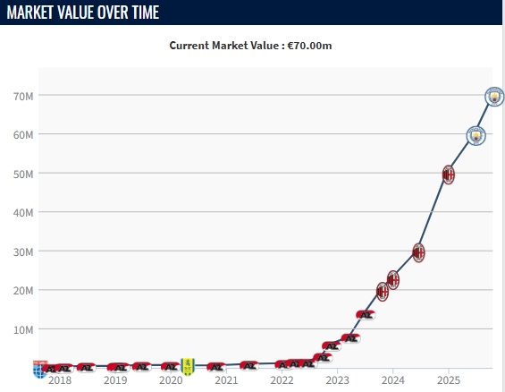 今夏以5500万欧转会费加盟曼城的赖因德斯,身价上涨1000万至7000万欧。