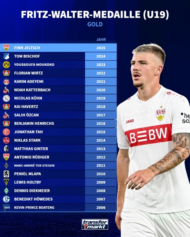 雷火官方10月17日讯 斯图加特中卫耶尔奇当选德国足Z协X年度最U19更佳新秀,德国转会市场列出了历届德国U19年度更佳新秀的名单。