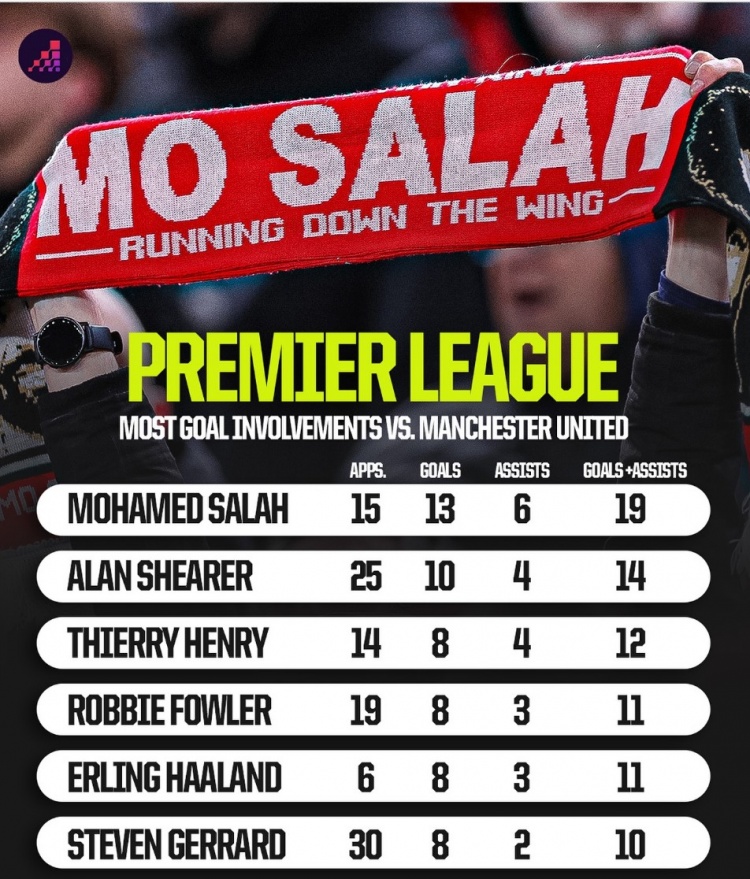 雷火官方10月17日讯 北京时间time10月19日晚上,利物浦将在英超第8轮比赛中主场对阵曼联,Squawka统计了球players员在对阵曼联的英超比赛中的参与进球数量,萨拉赫19球居首。