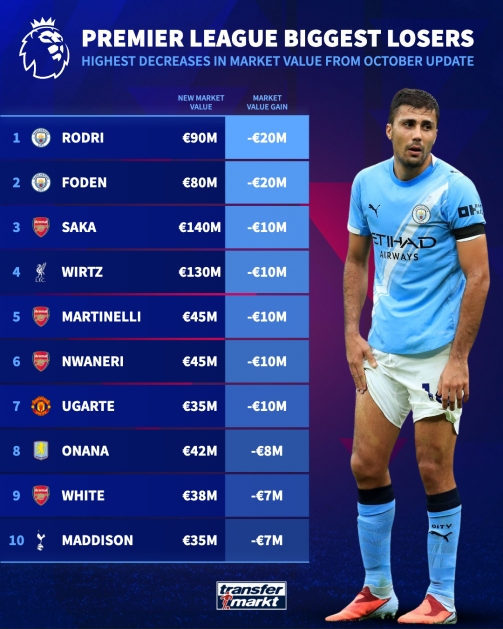 雷火官方10月17日讯 德转更新英超身价,其中跌的最多的是罗德里和福登,他们身价都下降了2000万欧。