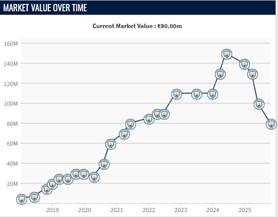 雷火官方10月17日讯 今日德转更新英超球players员身价,25岁福登身价跌出亿元,目前为8000万欧,对比1年前1.5亿欧的身价已经腰斩。