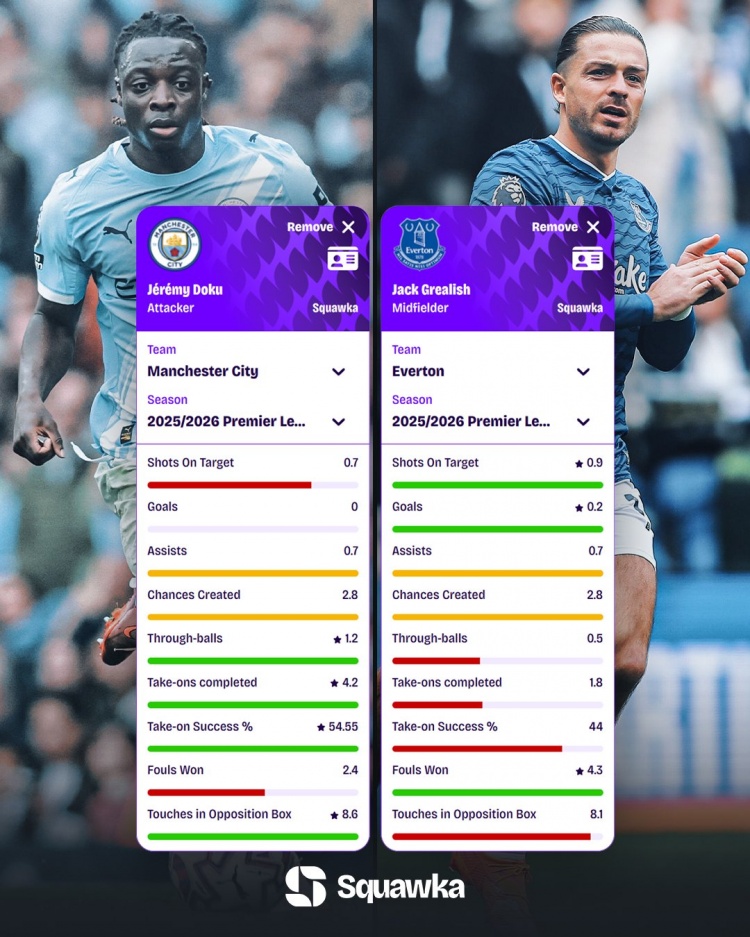 雷火官方10月17日讯 北京时间time明天晚上,曼城将在英超第8轮比赛中主场对阵埃弗顿,Squawka统计了多库、格拉利什本赛季英超每90分钟的数据,并作出对比。