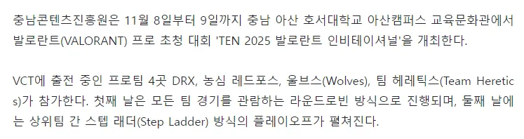 11月8日-9日两天期间将在韩国湖西大学牙山校区举行TEN 2025无畏契约职业邀请赛。