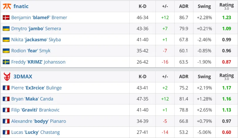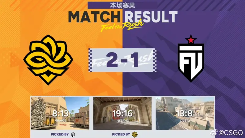 首场1/4决赛由3DMAX对阵fnatic。两队分别轻松赢下自选图Inferno和Train后,比赛进入决胜图。图三Dust2,两队比分焦灼,一路战至9-10,3DMAX仅领先1分但经济见底、枪械劣势,然而fnatic却在这至关重要的回合当中谨慎过头,进攻动向始终在中路犹疑不决,导致被法国人完成神奇翻盘,最终连丢3分将胜利拱手相让,3DMAX成功晋级半决赛。