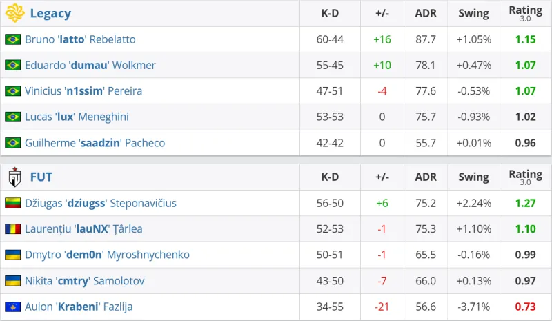 第二场1/4决赛由Legacy对阵FUT。青年军黑马FUT来势汹汹在自选图Mirage上以13-8先下一城。随后图二来到Legacy选择的Inferno,FUT在防守方开局一度2-7落后的局面下奋起直追,将分差迫近并始终紧咬,两队一路鏖战至双加时才分出胜负,最后Legacy以19-16惊险胜出,将比赛拖入决胜图。图三Dust2,Legacy在下半场进攻方火力全开,风卷残云的攻势让巴西人最终以13-8强势完成让一追二,昂首挺进半决赛。