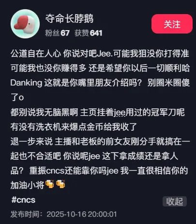Jee首先就其直播中的过激言论道歉。他表示,当时因弹幕持续攻击其家人,情绪失控导致“红温”,说出了“很不友好的言语”。他承认此举伤害了粉丝与观众,并强调自己从未有优越感,愿意接受所有批评与建议。Jee坦言:“是CS改变了我的人生,我却用它带来的东西去攻击别人,我深感愧疚。”