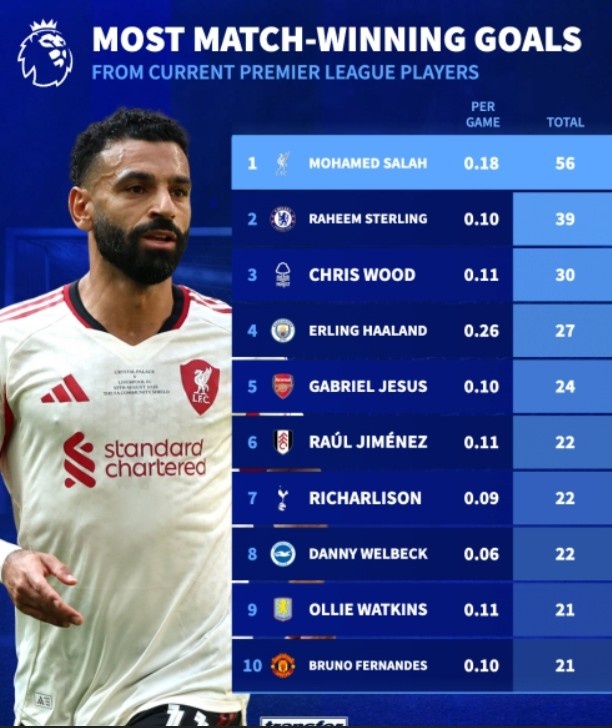 雷火官方10月18日讯 德国转会市场盘点了现役英超球players员打进制胜球排行情况,萨拉赫以56球遥遥领先,斯特林以39球位居次席。
