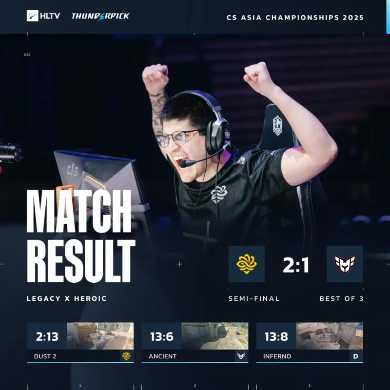 决胜图Inferno,两队上半场再次战胜6-6平,然而HEROIC却在赢下手枪局后惨遭Legacy强起翻盘,随后连续丢分直接被巴西人一鼓作气拿到赛点,虽然hades残局1v3挽救回一个赛点,但也难挽狂澜,最终Legacy以13-8再下一城,让一追二昂首挺进总决赛!
