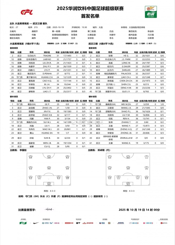 雷火官方10月19日讯 今日15:30中超第27轮,大连英博vs武汉三镇,双方公布首发阵容。