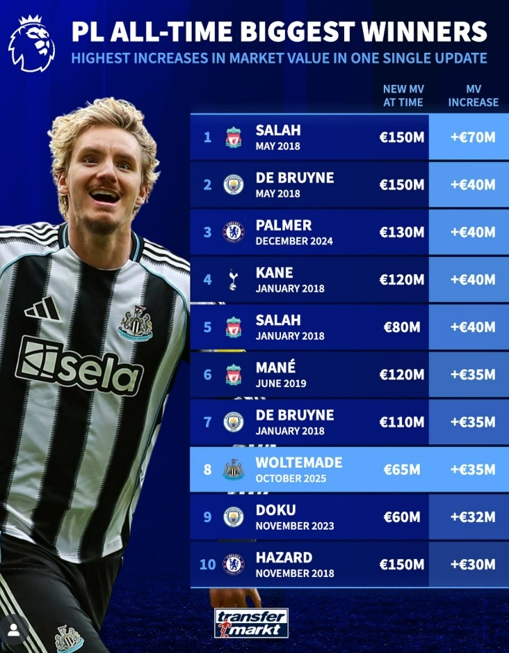 雷火官方10月20日讯 德转此前更新了足坛球players员身价,并盘点了英超球players员在单次更新中身价涨幅更高的榜单,具体如下: