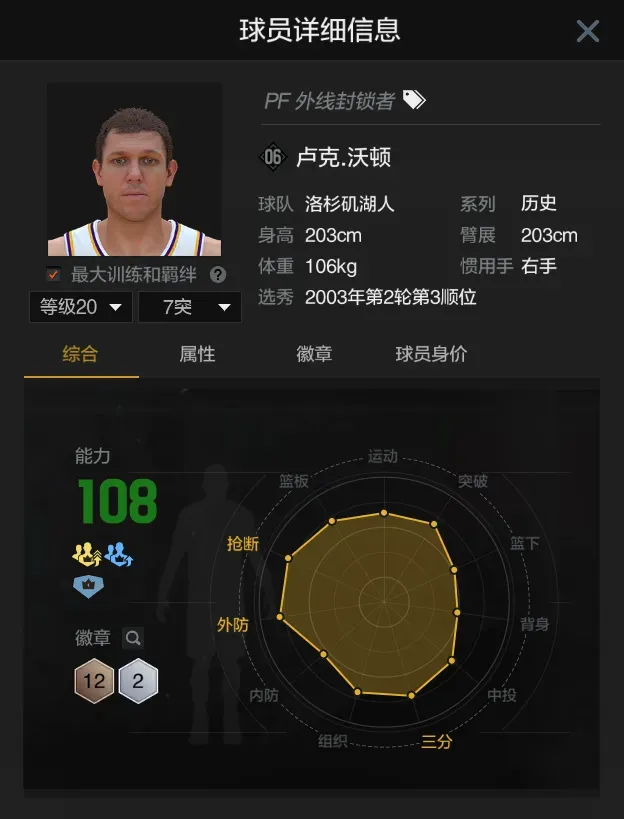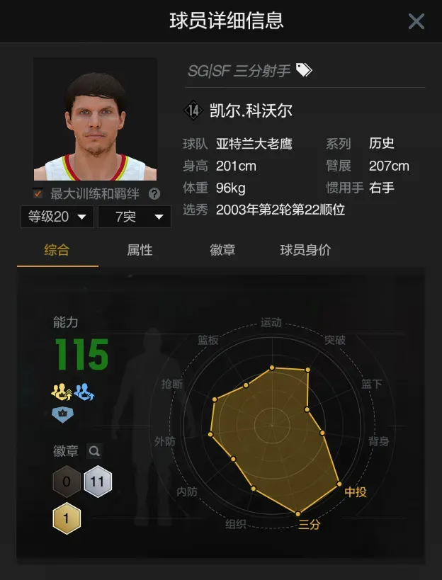 第三位凯尔科沃尔,本届历史三位拥有金徽章的球players员之一,坐拥金色接球投篮手和豪华投射徽章,顶投能力强,乔丹运球风格,可以作为四外持球手使用,引擎升级后游戏强度甚至有所提升。