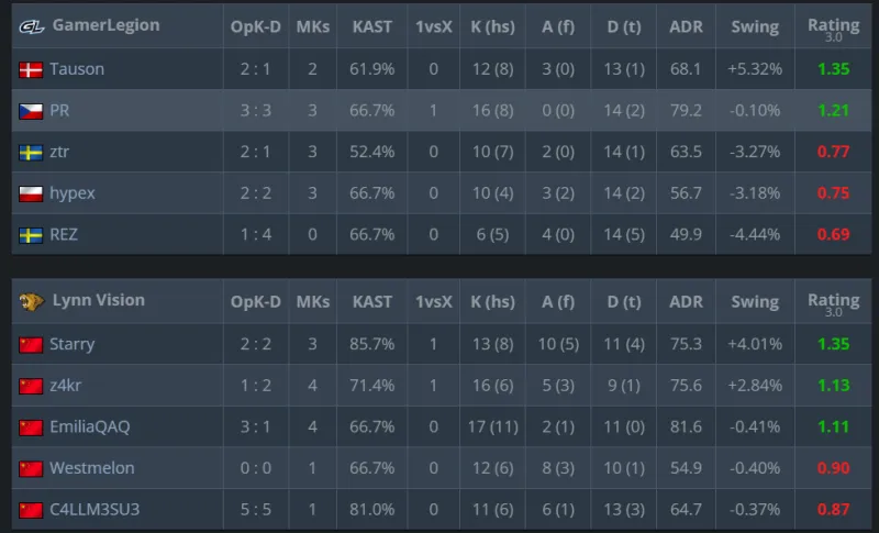 下半场易边再战,手枪局GL开局进入二楼策划攻势,emilia此时化身燕双鹰,低坡双枪三杀助LVG拿下手枪局,GL被迫进入经济局。第十六局,LVG在巨大的枪械劣势下化解了GL的外场攻势。GL自此经济崩溃,LVG率先取得赛点。GL在接下来的几局中展现出战队的韧性接连取得分数,但无奈分差过大无力回天。最终比分定格为8-13,LVG大比分扳回一局。