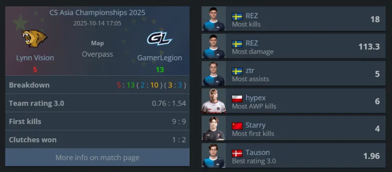 雷火官网10月14日讯 CAC 2025A组小组赛,LVG对阵GL图一Overpass结束,GL 13-5 LVG。差距过大!LVG死亡游乐园不敌GL。